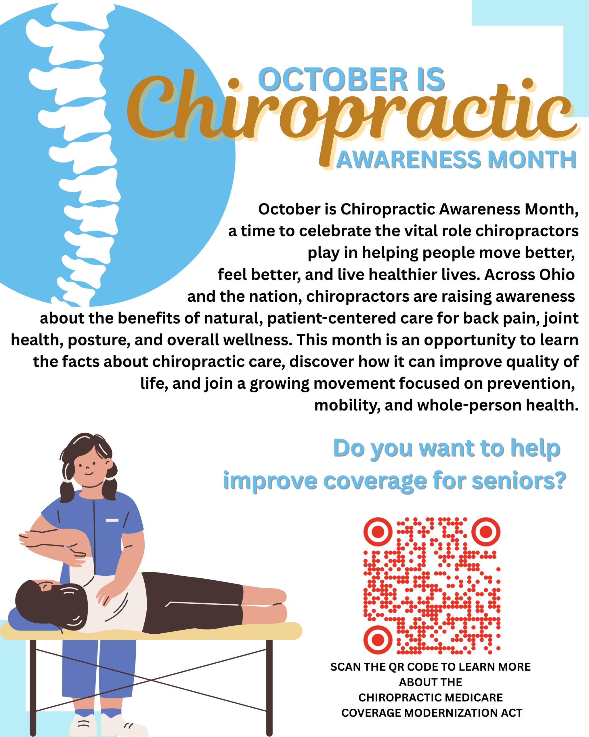 By placing it in your practice, you’re not only celebrating the profession but also equipping your patients with resources to learn more and get involved. Together, we can make chiropractic care more visible across Ohio!
